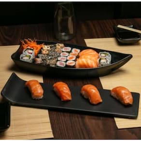 A linha Fuji foi criada para os pratos da culinária oriental. 100% melamina, apresenta textura fosca na cor preta. Com super resistência, a peça vai à lava-louças, não mancha e suporta temperatura de 70º por até 2 horas. Surpreenda seus convidados servindo pratos orientais com Haus.