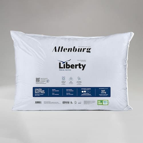 Com revestimento em percal 180 fios e recheio de fibra siliconizada, que proporciona super maciez, o travesseiro Liberty é não-alérgico e tem a altura certa para quem dorme de costas.