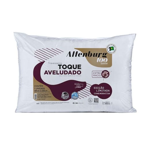 Travesseiro Altenburg Toque Aveludado Travesseiro Altenburg Toque Aveludado O Travesseiro Altenburg Toque Aveludado é ideal para quem dorme de costas. Seu toque é macio e confortável. Com enchimento 100% poliéster o travesseiro é extra macio. Este travesseiro faz parte de um edição limitada Comemorativa da Altenburg 100 anos.