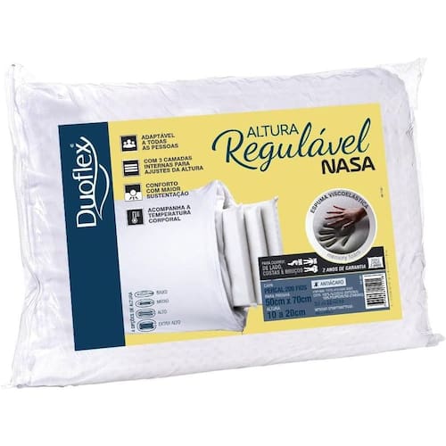 ........ ALTURA REGULÁVEL NASA 50CM X 70CM X 10CM á 20CM ........Informações do Produto:Os versáteis travesseiros Altura Regulável foram desenvolvidos para que o usuário possa regular e acertar a sua altura e maciez exatamente ao seu gosto e necessidade.O travesseiro possui 3 camadas internas e o usuário pode a qualquer tempo escolher entre 4 alturas, bastando removê-las ou adicioná-las, de maneira fácil, rápida, prática e higiênica.Tudo isso permite uma posição natural de descanso, trazendo apoio e conforto totalmente personalizados a anatomia de cada pessoa na posição escolhida para o seu sono.O design exclusivo e patenteado é constituído por:- 1 travesseiro com bolso interno e acesso lateral- 3 camadas internas individuais e removíveisA Duoflex disponibiliza o travesseiro Altura Regulável também nas espumas especiais Nasa e Látex, produzidas com total proteção antiácaros, fungos e bactérias.*** Não é embalado a vácuo.--- Características ---- Capa 100% Algodão- Viscoelástico- Altura Regulável--- Especificações ---- Formato: Tradicional- Altura: de 10 cm á 20 cm- Comprimento: 70 cm- Largura: 50 cm- Capa: 100% Algodão - Costurado.- Enchimento: Viscoelástico Nasa* Obs: medidas de acordo com a descrição da fabricante, quaisquer divergências entrar em contato com a mesma.--- Conteúdo da embalagem ---- 1 Travesseiro Regulável Nasa