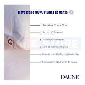 Ficha Técnica: - Cor: Branco - Composição do enchimento: 100% Plumas de Ganso - Material da capa: : Inlett 233 fios - 100% algodão de alta qualidade - Produto 100% natural - Matéria-prima europeia - Nível de sustentação: Baixo - Dimensões: 50 x 70 cm - Cuidados: Lavagem à seco recomendada. Não lavar à máquina.