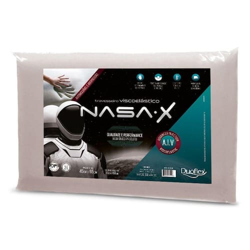 NASA é uma espuma viscoelástica moldada com alta viscosidade e densidade.Automoldável e termossensível, adapta-se ao contorno e a temperatura do corpo, exercendo menos pressão nas áreas mais quentes ou salientes, facilitando a circulação sanguínea.Além de oferecer maior capacidade de absorção do peso e distribuição equalizada da pressão sobre o corpo, o travesseiro NASA possui a propriedade de retorno lento ou memória, agindo como um verdadeiro amortecedor.A alta qualidade da espuma viscoelástica Duoflex, permite ao travesseiro NASA retornar à sua forma original, mesmo após compressão durante o transporte. Tudo isso torna o travesseiro NASA o ideal para a posição natural de descanso, prevenindo dores na cabeça, pescoço, costas, braços e ombros, garantindo um sono restaurador, com total proteção antiácaros, fungos e bactérias.Altura 10 cm