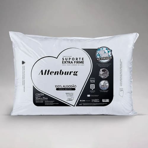 Experimente o Travesseiro Altenburg Suporte Extra Firme, ideal para quem busca um travesseiro firme sem abrir mão do conforto. Conhecido popularmente como o "travesseiro do coração" este travesseiro é especialmente indicado para quem dorme de lado, este travesseiro possui revestimento em percal 180 fios, 100% algodão, oferecendo um toque suave e aconchegante.