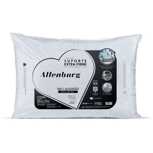 Travesseiro Altenburg Suporte Extra Firme – Ideal para quem dorme de lado, oferece apoio perfeito para os ombros e alinhamento da coluna. Resistente, mantém a forma por mais tempo, com ação antimicrobiana e antialérgica, garantindo conforto e noites de sono reparadoras.