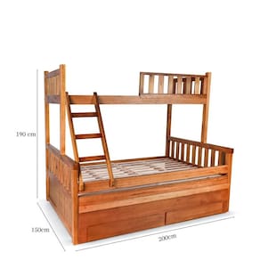 Características: Estrutura de Madeira Maciça Estrado de Madeira Acabamento em verniz fosco Cama auxiliar possui rodízios: Sim Rodízios fixo: Sim parafusados Rodízios de silicone ou plástico: zinco amarelo Tamanho do colchão indicado para cada cama: Cama de cima 88X188, cama auxiliar 88x188 e cama do meio 1,38x1,88 Indicação da altura do colchão da cama auxiliar: até 18cm Peso suportado:150kg cada cama Não acompanha colchão