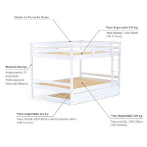 Material Principal: Madeira | Cor Predominante: Branco | Necessita Montagem: Sim | Acompanha Colchão: Não | Tipo de Cama: Beliche | Tamanho da Cama: 138 | Altura: 148 | Largura: 146,5 | Peso máximo suportado: 120 | Peso: 67 | Comprimento: 199 | Cor Via: Branco | Altura com Embalagem: 148 | Largura com Embalagem: 146,5 | Comprimento com Embalagem: 199 | Peso com Embalagem: 67 | Descrição do Tamanho: 148 x 146,5 x 199