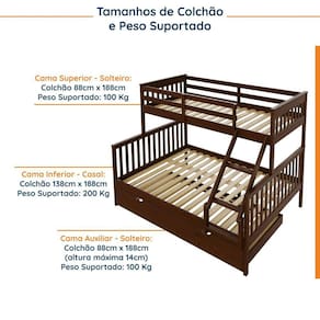 O Treliche Casal Madeira Maciça Mani é a solução perfeita para quem tem pouco espaço disponível. Um produto funcional que conta com cama de casal, cama de solteiro e possui também uma cama auxiliar. Com ela você poderá acomodar suas visitas com conforto e praticidade. Produzida em madeira maciça de pinus. Depois nos conte como foi a experiência de compra e como ficou seu ambiente nos comentários! Acabamento dos Pés: Pintura Acompanha Cama Auxiliar: Sim Acompanha Colchão: Não Altura do Estrado até o Chão: 32,3 cm Altura do Estrado Superior até o Chão: 122,5 cm Altura dos Pés: 28 cm Ambiente Principal: Quarto Cama Auxiliar Acompanha Colchão: Não Cama Auxiliar com Rodízio: Sim Cama Auxiliar Suporta Até (kg): 100 kg Complexidade da Montagem: Alta: deve ser montado por um montador especializado Cor: Castanho Cor do Produto: Castanho Escala de Brilho: Fosco Itens Inclusos: Treliche + Manual de Instruções Linha ou Coleção: Mani Manual de Montagem e Instalação: https://product-hub-prd.madeiramadeira.com.br/872371/documents/42e210c6-9840-46b9-851d-3a9e40be8d71anualdemontagemtrelicheman.pdf Material da Escada: Madeira Maciça Material do Estrado: Pinus Material dos Pés: Madeira Maciça Material Principal: Madeira Maciça Necessita Montagem: Sim Número de Camas: 03 Origem do Produto: Nacional Permite a Utilização de Cama Auxiliar: Sim Peso: 85,5 kg Peso Suportado por cada cama: 180 kg Possui Gavetas: Não Possui Grade: Sim Possui Pés: 04 Possui Portas: Não Possui Prateleiras: Não Possui Rodízio: Não Recomendações de Uso, Manutenção e Limpeza: Deve ser realizada com pano limpo e seco. Sapatas Niveladoras: Não Sistema de Montagem: Parafusos e Cavilhas. Tamanho da Cama: Solteiro Tamanho do Colchão Indicado (L x C): 188cmx88cm solteiro e 188cmx138cm casal Tamanho do Colchão Indicado Cama Auxiliar: 88cm x 188cm x 12cm Tipo de Cama: Treliche Tipo de Colchão: Casal Tipo de Estrado: Fixo Tipo de Madeira Maciça: Pinus Tipo de Madeira Maciça dos Pés: Pinus Trava de Segurança: Não Ean: 7909903442777