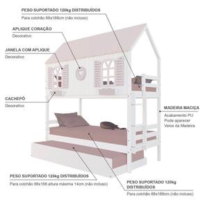 Material Principal: Madeira | Cor: Branco | Rosa | Necessita Montagem: Sim | Acompanha Colchão: Não | Tipo de Cama: Beliche Solteiro Casinha