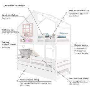 Diferenciais: Escada Fixa, Auxiliar com 4 Rodízios, Grade de Proteção Removível, Casinha com fechamento em MDF, Janela e Prateleira para Livros e Decoração, Montagem Reversível (Lado Direito ou Lado Esquerdo)