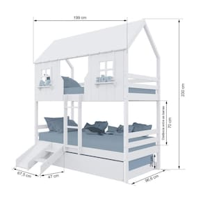 Diferenciais: Escada Fixa, Auxiliar com Rodízios, Casinha e Telhado com fechamento em MDF, Janela e Prateleira Decorativa, kit Escada/ Escorregador.