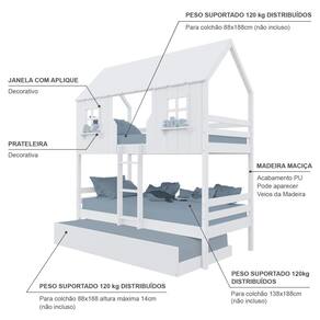 Diferenciais: Escada Fixa, Auxiliar com Rodízios, Casinha e Telhado com fechamento em MDF, Janela e Prateleira Decorativa.
