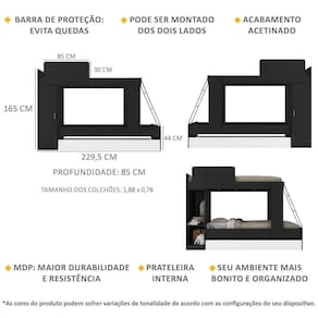 O Treliche com Colchão Incluso 1 Porta Havana Multimóveis é produzido em MDP com acabamento acetinado (cerca de 20% de brilho), garantindo maior durabilidade e resistência. Conta com barra de proteção na cama superior para evitar quedas, 1 porta lateral com prateleira interna para organizar seus pertences, além de escada metálica em ângulo que facilita o acesso à cama superior. Versátil, pode ser montado dos dois lados - esquerdo ou direito. O treliche deixará o seu quarto mais funcional e dinâmico para acomodar seus filhos ou aquelas visitas de final de semana. Com capacidade para suportar até 80kg nas camas principais e 70kg na cama auxiliar, este produto é perfeito para quem busca otimizar espaço sem abrir mão do conforto. Acompanha colchões D23 com tratamento antiácaro e antialérgico que proporcionam noites de sono mais tranquilas e saudáveis.