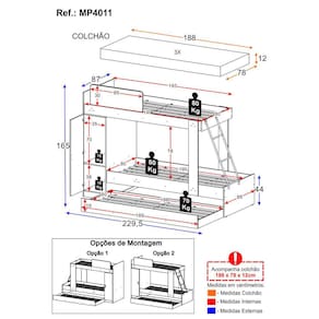 Dimensões do produto montado: Treliche - Altura: 165cm | Largura: 229,5cm | Profundidade: 87cm Colchão - Altura: 12cm | Largura: 188cm | Profundidade: 78cm *Você pode consultar as medidas detalhadas na imagem técnica do produto.