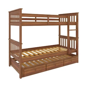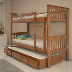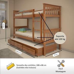 Modelo: B10401Material: Madeira Maciça de Pinus de Reflorestamento MDFPintura/Acabamento: Pu Branco/Castanho (deixando aparente os veios da madeira)Medidas das Gavetas: A: 17 cm - L: 60 cm - P: 53,5 cmPara Colchões de Dimensões (cm x cm): 188x88 - Colchão da Cama Auxiliar Máximo 14 cm altura.Colchão: Não inclusoPeso Suportado : 120 Kg por camaAcessórios: Escada Fixa e Cama Auxiliar (com rodízios) (com gavetas).