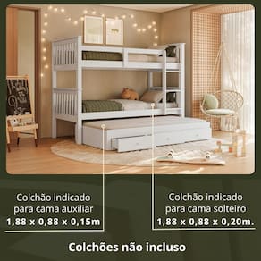 Modelo: WBL104O01030 Material: Madeira Maciça de Pinus de Reflorestamento e mdf de 2,2cm de espessura. Pintura/Acabamento: Pu Branco/Castanho e UV 30% brilho (deixando aparente os veios da madeira) Medidas das Gavetas: A: 17 cm - L: 60 cm - P: 53,5 cm Para Colchões de Dimensões (cm x cm): 188x88 - Colchão da Cama Auxiliar Máximo 15 cm altura. Colchão: Não incluso Peso Suportado : 120 Kg por cama Acessórios: Escada Fixa e Cama Auxiliar (com rodízios) (com gavetas). Altura entre camas: 70cm