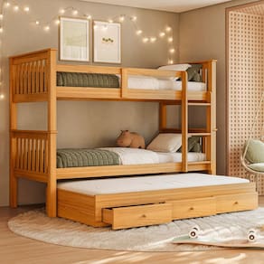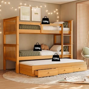 Treliche de solteiro composta por 1 beliche + 1 cama auxiliar com gavetas. Estrutura em madeira maciça de pinus de reflorestamento e MDF de 2,2 cm de espessura, com pintura UV 30% de brilho, que mantém os veios da madeira aparentes. A cama auxiliar possui rodízios para facilitar o manuseio e gavetas para armazenamento.