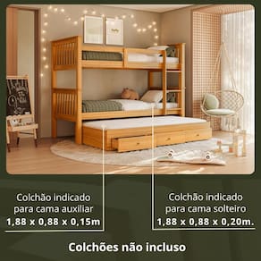 Produto ideal para colchões de 188x88 cm. A cama auxiliar comporta colchão de até 15 cm de altura. Peso suportado de até 120 kg por cama.