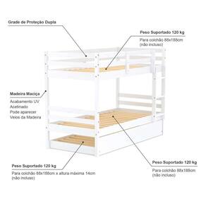 Material Principal: Madeira | Cor Predominante: Branco | Necessita Montagem: Sim | Acompanha Colchão: Não | Tipo de Cama: Treliche | Tamanho da Cama: 88 | Altura: 148 | Largura: 96,6 | Peso máximo suportado: 120 | Peso: 67 | Comprimento: 199 | Cor Via: Branco | Altura com Embalagem: 148 | Largura com Embalagem: 96,6 | Comprimento com Embalagem: 199 | Peso com Embalagem: 67 | Descrição do Tamanho: 148 x 96,6 x 199