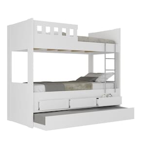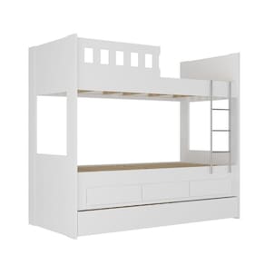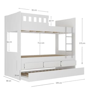 A Treliche 3 Gavetas com Escada e Grade de Proteção Foscarini possui amplo espaço para acomodar as roupas de cama e outros pertences, deixando o seu ambiente organizado. Possui 3 gavetas com corrediças telescópicas que proporcionam abertura total e deslize suave. Pensando no conforto e segurança, a cama superior possui grade de proteção lateral e um fácil acesso através da escada. É ideal para colchões de solteiro de 88 x 188 cm. É produzida 100% em MDF e seus diferenciais são notáveis na qualidade dos acabamentos e pintura em estufas modernas UV. Sua estrutura principal é de 18mm com cabeceira em 25mm. Seu sistema de montagem é rápido, fácil e descomplicado, realizado através de parafusos, minifix e cavilhas. Se encaixa perfeitamente em vários estilos de decoração. Aproveite. Acabamento da Gaveta: Pintura Texturizada UV Acompanha Cama Auxiliar: Sim Acompanha Colchão: Não Altura do Estrado até o Chão: 137.3 Ambiente Principal: Quarto Infantil Cama Auxiliar com Rodízio: Sim Cama Auxiliar Suporta Até (kg): 100 codigo_ean: 7908243318551 Complexidade da Montagem: Média: pode ser montado por mais de uma pessoa e/ou necessite de maior conhecimento para montagem Cor: Branco Cor do Produto: Branco Escala de Brilho: Fosco Escala de Brilho da Gaveta: Fosco Gaveta com Chave: Não Itens Inclusos: 1 Treliche, Kit Ferragens e Manual de Montagem. Linha ou Coleção: Viena Manual de Montagem e Instalação: https://product-hub-prd.madeiramadeira.com.br/878271/documents/fc1dba61-1021-45b1-9621-e3601a75906f1652402908910.pdf Material da Gaveta: MDF Material do Estrado: Pinus e Eucalipto Material Principal: MDF Necessita Montagem: Sim Origem do Produto: Nacional Permite a Utilização de Cama Auxiliar: Sim Peso: 148 Peso Máximo por Gaveta: 15 Possui Baú: Não Possui Pés: Não Possui Portas: Não Possui Prateleiras: Não Recomendações de Uso, Manutenção e Limpeza: Limpar com flanela ou pano macio seco, não utilizar produtos abrasivos, desengordurantes, álcool ou solvente. Não expor o produto diretamente à luz solar e à umidade. Sistema de Montagem: Parafusos, minifix e cavilhas. Suporta Até (kg): 300 Tamanho do Colchão Indicado (L x C): 88 X 188 Tamanho do Colchão Indicado Cama Auxiliar: 88 x 188 Tipo de Cama: Treliche Tipo de Colchão: Solteiro Tipo de Corrediça da Gaveta: Metálica Telescópica Tipo de Estrado: Removível Tipo de Puxador da Gaveta: Embutido Ean: 7908243318551