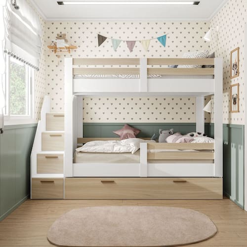 A Treliche Juvenil com Escada Betina Mobikasa e Colchao Gazin oferece conforto, resistencia e otimo aproveitamento de espaco. Estruturada em MDP 15 mm e estrado em MDF 25 mm, suporta ate 100 kg por cama. A escada pode ser montada em ambos os lados e conta com degraus reforcados. A cama auxiliar em FF garante alta durabilidade e visual moderno. O colchao Gazin D20 proporciona conforto com tecido plano resistente e facil de limpar.