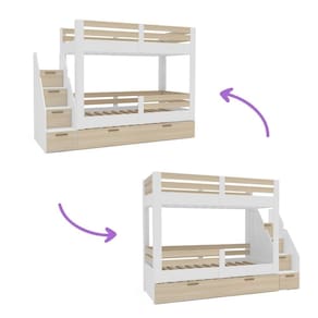 Caracteristicas Cama: Acabamento em FF Estrutura MDP 15 mm Estrutura Estrado MDF 25mm Indicado para colchao de 88x1,88cm Limite de peso permitido para ambas as camas e de 100kg Peso suportado por degraus 80kg Porta basculante com dobradica curva Puxadores F14 em madeira Sapatas redondas