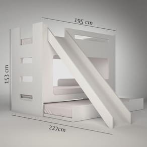 Otimização de espaço, sem deixar de lado o estilo e a personalização. A Linha Lumi surge como uma ótima alternativa para ambientes pequenos. É utilizado em toda a sua estrutura MDF das melhores marcas do país, com espessura de 2,5cm, o que torna o móvel muito mais forte e durável. Possui um design moderno, com as laterais fresadas em chapas inteiriças, tendo lateral, pés e meia guarda em uma só peça. A escada de acesso à cama superior é embutida na peseira, também fresada na própria peça. A cama superior possui grade de proteção reforçada, para maior segurança da criança. Utilizado colchão padrão solteiro (1,88x0,88mt) nas 3 camas. A pintura laca traz o acabamento de alto padrão. Pode ser adquirido nas versões Sem escorregador ou Beliche. Acabamento dos Pés: Laca Acompanha Cabeceira: Não Acompanha Cama Auxiliar: Não Acompanha Colchão: Não Altura do Estrado até o Chão: 13 cm Altura dos Pés: 10 Altura Máxima dos Pés: 10.0000 Ambiente Principal: Quarto Infantil codigo_ean: 7909903311868 Complexidade da Montagem: Média: pode ser montado por mais de uma pessoa e/ou necessite de maior conhecimento para montagem Cor: Branco Cor do Produto: Branco Cor Flex: Não Escala de Brilho: Fosco Extensível: Não Informações Complementares: Pintura atóxica, estrutura reforçada, escadas embutidas na peseira. Itens Inclusos: 1 Beliche, 1 Escorregador, Kit Ferragens e Manual de Montagem Linha ou Coleção: Lumi Manual de Montagem e Instalação: https://product-hub-prd.madeiramadeira.com.br/838581/documents/99d0b6ec-e0f8-4091-947d-7c47c521d69d3157manualbelichelumirev01.pdf Material do Estrado: Madeira Material dos Pés: MDF Material Principal: MDF Montagem Flex: Não Necessita Montagem: Sim Origem do Produto: Nacional Permite a Utilização de Cama Auxiliar: Não Peso: 165 kg Possui Baú: Não Possui Escrivaninha: Não Possui iluminação: Não Possui Pés: 04 Possui Portas: Não Possui Prateleiras: Não Possui Rodízio: Não Recomendações de Uso, Manutenção e Limpeza: Para higienização, utilizar um pano levemente umedecido. Sapatas Niveladoras: Não Sistema de Montagem: Parafusos, Minifix, Cavilhas. Suporta Até (kg): 160 kg Tamanho da Cama: Solteiro Tamanho do Colchão Indicado (L x C): 88cm x 188cm Tipo de Cama: Beliche Tipo de Colchão: Solteiro Tipo de Estrado: Fixo Marca: Timber