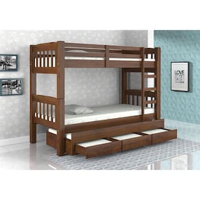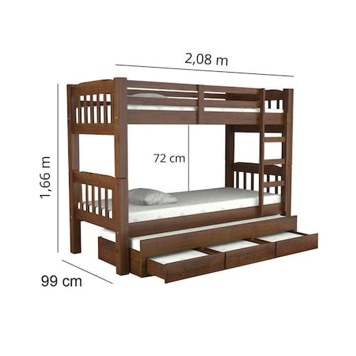 Treliche itália castanho com 3 gavetas - Kamabel A treliche Italia com 3 gavetas em Madeira Maciça reúne o estilo e a sofisticação que você precisa, o seu ambiente sem dúvida ficará mais lindo e decorado! Produzida em excelente estrutura que oferece mais resistência ao móvel e com perfeito acabamento em Pintura U.V. que proporciona sensação ao toque e garante maior durabilidade. Tenha mais espaço, conforto e praticidade em suas noites de sono!Características GeraisPara Colchão 0.88 x 1.88 Obs: OS COLCHÕES NAO ACOMPANHAM O PRODUTO!!Produto fabricado em 100% Madeira Maciça Pinus.Espessuras dos pês 0.8 x 0.8 cmGrade Lateral maciça reforçada;Possui Estrado Reforçado;Exclusiva Grade de Proteção na parte lateralSuporta no Máximo 150 kg;Possui um Fino Acabamento;Cama Auxiliar com 3 gavetas e rodízios.Ripas e sarrafos do estrado em madeira maciça.colchoes com máximo 14cm de altura para utilizar na cama AuxiliarProduto versátil encaixa em vários ambientes.Lindo design.Pode colocar escada em ambos os ladosMedidas aproximadas:Produto montado: Altura: 166 cm Largura: 208 cm Profundidade: 99 cmGavetões área útil: Altura: 9,5cm x Largura 47,5cm x Profundidade: 47,5cmAltura de cada travessa 83cmAs barras tem 12cm de larguraMedida da cama auxiliar:Altura 43cm x largura 89cm x Comprimento 190cmEspaço do vão entre as camas 72cm Produto entregue desmontado em 3 volumes Cubagem: 0,2912 Peso: 49 kg.