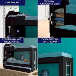 A Treliche Solteiro é a solução prática e elegante para otimizar seu espaço com conforto e estilo. Estrutura robusta em MDP 15mm, oferece durabilidade e resistência. Com 225cm de comnto x 87cm de largura ideal para quartos compactos, permitindo acomodar visitas sem complicações e para quem busca versatilidade sem abrir mão do conforto. Conta com uma cama auxiliar com rodízios que facilitam a abertura ou fechamento, proporcionando uma cama extra sem ocupar espaço permanente. Além disso, possui 01 porta com dobradiças metálicas, 04 nichos e cabeceira baú, que garantem espaço extra para armazenar roupas de cama, travesseiros e outros itens de sua preferência. Com escada embutida na estrutura do móvel, projetada para dar acesso seguro à cama superior, ocupando pouco espaço. Combina um design moderno com funcionalidade, adicionando um toque de sofisticação à decoração do ambiente. Indicado colchão solteiro 78x188x12cm. Indicamos que o colchão tenha no máximo 12cm de altura para ocorrer o fechamento total da cama auxiliar. Este móvel chegará em sua casa separado em 03 volumes.