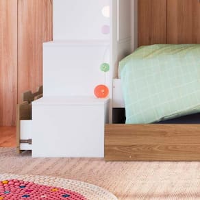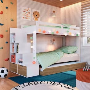 O quarto da sua ou suas crianças ficará ainda mais charmoso com a nossa Cama Treliche. Com escadas laterais, uma praticidade para a subida e descida do seu pequeno. Em cada degrau, nichos que facilitam e otimizam o espaço. Nestes nichos, podes guardar e organizar vários brinquedos, livros e outros acessórios. Nos últimos dois nichos rentes ao chão, duas gavetas que acompanham o produto e o tornam ainda mais completo! Permite a montagem da escada lateral tanto do lado direito quanto lado esquerdo. Para completar e tornar o produto a verdadeira Treliche, acompanha a cama auxiliar, permitindo que tanto os pais quanto aquele amiguinho possam passar uma noite super legal. Rodízios na cama auxiliar que facilitam sua movimentação.