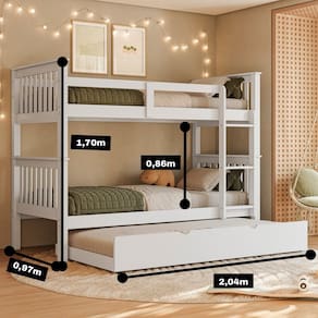 A Beliche em madeira maciça de solteiro + cama auxiliar de solteiro é ideal para quartos compactos que precisam de móveis que não ocupam muito espaço. Feita para quem deseja acomodar seus amigos e parentes com mais conforto. Conta com 3 camas, cada uma podendo suportar até 120 Kg. Para quem for dormir na parte superior da cama, conta com grades de proteção, fornecendo muito mais segurança. A Beliche em madeira maciça de solteiro + cama auxiliar de solteiro possibilita um aproveitamento inteligente do espaço disponível em sua casa, sem deixar de agregar beleza, praticidade e conforto em seu dia a dia. Além disso, o móvel acompanha Cama Auxiliar, o que otimiza ainda mais o espaço do ambiente.