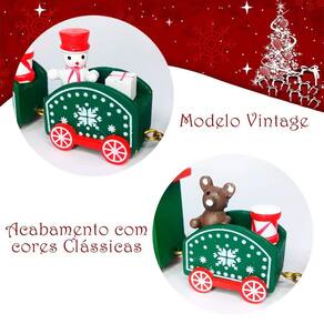 Nos vagões, passageiros muito especiais trazem ainda mais vida e alegria ao cenário: um urso, um boneco de neve alegre e um menino encantado com o espírito natalino. As rodas, também de madeira, complementam o visual rústico e autêntico, mas não permitem o movimento, reforçando o caráter decorativo da peça. Os vagões e a locomotiva se conectam facilmente por meio de encaixes simples, facilitando o manuseio e a disposição do trem no ambiente.