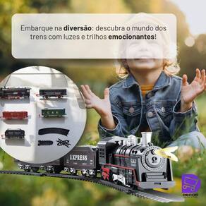 Conjunto completo inclui locomotiva, trilhos e 5 vagões