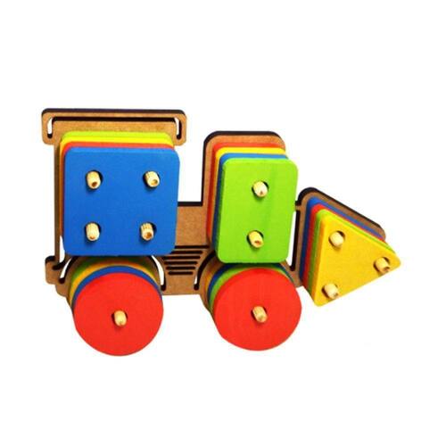 - Contém: 1 trem em MDF e 20 peças coloridas em formas geométricas