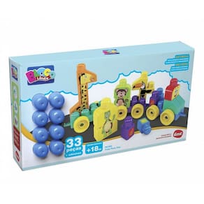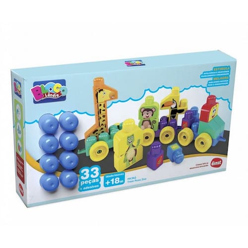 Com os blocos de montar Trem Puxa Zoo da Dismat a diversão e o aprendizados andam juntos. O mundo da Blocolândia esta de portas abertas para as crianças. Um brinquedo super legal e super bonitinho que vai levar as crianças para uma viagem de trem com animais do zoológico. Com 33 peças para encaixar que estimula a inteligência e criatividade das crianças de forma divertida. Estimula também o planejamento e a organização. Melhora as habilidades motoras, foco e concentraçãoIndicado pra crianças a partir de 18 meses.Nesse lindo kit já inclui 7 pinos simples, 1 pino duplo, 5 pinos arredondados, 5 pinos angulares, 3 vagões e 12 rodas. Acompanha também uma cartela de adesivos. Solte toda a imaginação e monte o que quiser com esses maravilhosos blocos de montar.