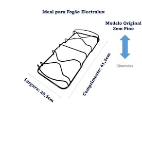Grelha (trempe) em Ferro Fundido para fogão ElectroluxCompatível com os fogões Electrolux:- Modelo Grelha Sem PinoInformações Técnicas:Marca: ElectroluxCor: PretoLargura: 20,5cmComprimento: 41,2cmPeso: 0,540kgAtenção: Antes de realizar a compra, favor verificar as medidas nas imagens do anúncio e comparar com seu fogão.