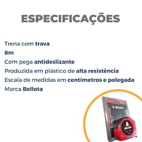 Tamanho: 8m Escala de medidas: centímetros e polegadas Material: borracha, plástico e aço Marca: bellota