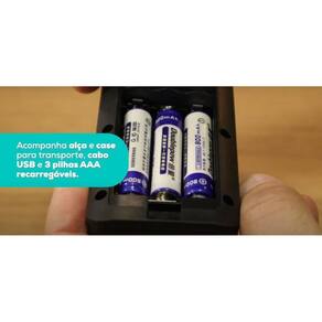 Acompanha 3 pilhas AAA reccaregáveis , cabo USB e case para transporte.