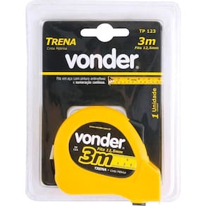 Trena aço 3mx12,5mm curta vonder: a ferramenta ideal para suas medições diárias com a qualidade e confiabilidade da marca vonder, esta trena é perfeita para quem busca precisão e praticidade. Seu estojo anatômico em abs de alta resistência garante durabilidade e conforto durante o uso. A fita de aço possui pintura fosca antirreflexo, numeração contínua e graduação em milímetros/polegadas, facilitando a leitura e proporcionando medições precisas. Além disso, a trena conta com um sistema de trava eficiente, alça em nylon e presilha para cinto, tornando o transporte seguro e prático. O gancho ajustável na ponta da fita permite medições internas e externas com maior precisão, ideal para profissionais e entusiastas do faça você mesmo.Especificações técnicas:- marca: vonder- código universal de produto: 7893946004057- modelo: 7893946004057- comprimento da trena: 3 m- largura da fita da trena: 12,5 mm- revestimento da fita da trena: pintado- acabamento da fita da trena: pintura fosca antirreflexo- graduação da trena: mm/pol- material da caixa da trena: abs de alta resistência- sistema de trava da trena: botão- classe de precisão: classe iifunções e características:- estojo anatômico em abs- fita antirreflexo- trava da fita- gancho ajustável- alça em nylon- presilha para cintoinstruções de uso:1. Puxe a fita até a medida desejada.2. Utilize o botão de trava para fixar a fita na posição.3. Para medições internas, ajuste o gancho na ponta da fita.4. Após o uso, libere a trava e recolha a fita cuidadosamente.