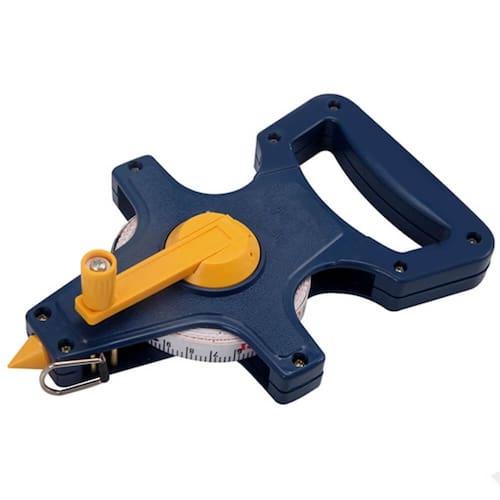 - Fita em fibra de vidro com acabamento amarelado graduada em até 50 metros com anel para fixação.