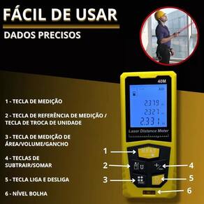 - Medição Precisa: Distância de até 40 metros com precisão. - Modos Diversificados: Medições de Distância, Área, Volume e Pitágoras para atender a diferentes necessidades. - Memória Automática: Retenção de dados automática, lembrando a última unidade de medida utilizada mesmo após o desligamento. - Tela com Backlight: Visor iluminado para fácil visualização em qualquer condição de iluminação. - Nível de Bolha: Inclui nível de bolha integrado para maior precisão no posicionamento. - Design Compacto e Leve: Fácil de transportar e manusear, ideal para o dia a dia. - Economia de Energia: Função de desligamento automático após 150 segundos para preservação da bateria.