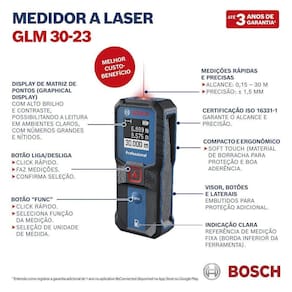Trena laser bosch 30m modelo glm 30-23 profissional Trena a laser compacta bosch com faixa de medição de 0,15 a 30,0m Com laser vermelho