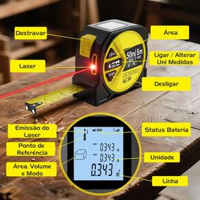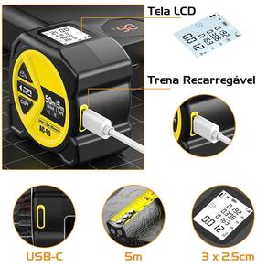 Trena Laser Fita Métrica Digital Display LCD 50m 5m 19mm#DESCRIÇÃO A Trena Laser Digital é a ferramenta ideal para quem busca eficiência e versatilidade em medições. Combinando a tecnologia do laser (alcance de até 50 metros) com a fita métrica tradicional (5 metros de comprimento e 19mm de largura), ela é perfeita para uso intenso ou doméstico.#CARACTERÍSTICASMedição por Laser de até 50 metrosFita Métrica de 5 metros com 19mm de larguraPrecisão de alta performanceModo de referência ajustávelTrava da fita com botão de destrave rápidoBotão para alternar entre unidades de medida (m, ft, in)Indicação de nível de bateriaLaser com ponto de referência e emissão clara#ESPECIFICAÇÕESPrecisão de Medição: +2mm +50 x 10-6 DClasse do Laser: llUnidade: M/pés/pol² + pol²Tempo de Medição 3 SegDesligamento Automático: 15 Seg#IDEAL PARAMedições em obras e reformasProjetos de arquitetura e engenhariaInstalações elétricas e hidráulicasUso em marcenaria e design de interiores#ESPECIFICAÇÕES TÉCNICASMedias: 7 X 5,5 X 4cmPeso: 226gAlcance do laser: até 50 metrosComprimento da fita: 5 metrosLargura da fita: 19mmTela: Display LCD com iluminaçãoModos de medição: distância, área, volume, medição contínuaAlimentação: Bateria interna recarregávelMaterial: Plástico ABS resistente com acabamento emborrachado#ITENS INCLUSOS1x Trena1x Cabo USB-C1x Manual