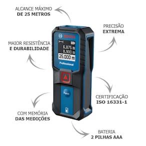 A Trena Laser GLM 25-23 Bosch possui um alcance máximo de 25 metros, ideal para medições em interiores.