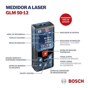 Trena laser glm50-12 bosch leitura até 50 metros + acess Medidor a laser glm 50-12 bosch professional 50m + chave teste A glm 50-12 é ideal para medição em locais de difícil acesso, pois o profissional consegueFazer medições da sua área sem sair da sua posição, e também não precisa de um auxiliar. Os cálculos são confiáveis e precisos, evitando erros nas medições. Principais características: Conversão com um pressionamento Botão de conversão dedicado para troca imediata da unidade com uma única pressão Interface homem-máquina ihm de fácil utilização para seleção rápida de funções de medição Tecnologia de display colorido para fácil interpretação de informações e medições essenciais Dados técnicos da glm 50-12: Díodo laser: 635 nm, 1 mw Faixa de medição: 0,05 a 50,00 m Peso aprox.: 0,1 kg Tempo de medição, típico: 0,5 s Classe de laser: 2 Precisão de medição, típica: 1,5 mm Mais divergência dependente do uso Tempo de medição máx.: 4 s Alimentação elétrica: 2 x 1,5 v lr03 aaa Dispositivo de desconexão automática: 5 min Unidades de medição: m/cm Capacidade da memória valores : 15 Proteção contra pó e projeções de água: ip 54 Rosca do tripé: 1/4 Cor laser: vermelho Faixa de medição, até: 50 m Itens que acompanham o medidor:Bolsa; 2 pilhas de 1,5 v lr03 aaa ; Certificado do fabricante;Chave teste imagem ilustrativa .