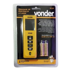 Indicado para ambientes internos e externos. Realiza medições de distância, contínua (trena eletrônica), área, volume, indireta (Pitágoras simples e Pitágoras com adição), medição de máximo e mínimo, adição e subtração. Permite a realização de medições em 5 unidades diferentes. Conta com função memória das últimas 10 medições. Duração aproximada das pilhas alcalinas: 5.000 medições. Desligamento automático do laser em aproximadamente 30 segundos e do aparelho em 180 segundos. Possui 3 pontos de referência para medição: frontal, traseiro e dispositivo para cantos, além de indicador de nível de carga das pilhas. Possui alça multiuso, usada para transporte e medições com o dispositivo para cantos, e nível bolha. É extremamente leve e compacto, facilitando a portabilidade e o manuseio. - Faixa de medição do medidor de distância a laser: 0,05 m a 40 m - Precisão do medidor de distância a laser: +/- 3 mm - Unidades de medida: Sistema métrico, polegada fracionária, pé, pé/polegada fracionária e sistema chinês - Comprimento da onda do medidor de distância a laser (nm): 620 nm - 690 nm - Resolução na unidade metros: 1 mm - Classe do laser do medidor de distância: Classe 02 - Classe de proteção IP do medidor de distância a laser: IP 54 - Potência do laser: 1 mW - Alimentação: 2 pilhas (AA - alcalinas) - Temperatura de trabalho do medidor de distância a laser: 0°C a 40°C - Comprimento do medidor de distância a laser: 124,0 mm - Largura do medidor de distância a laser: 42,0 mm - Espessura do medidor de distância a laser: 23,0 mm - Massa aproximada: 85 g Conteúdo da Embalagem: 1 Medidor de distância a laser 2 pilhas AA Modelo: VD 040