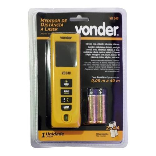 Indicado para ambientes internos e externos. Realiza medições de distância, contínua trena eletrônica , área, volume, indireta Pitágoras simples e Pitágoras com adição , medição de máximo e mínimo, adição e subtração. Permite a realização de medições em 5 unidades diferentes. Conta com função memória das últimas 10 medições. Duração aproximada das pilhas alcalinas: 5.000 medições. Desligamento automático do laser em aproximadamente 30 segundos e do aparelho em 180 segundos. Possui 3 pontos de referência para medição: frontal, traseiro e dispositivo para cantos, além de indicador de nível de carga das pilhas. Possui alça multiuso, Utilizado para transporte e medições com o dispositivo para cantos, e nível bolha. É extremamente leve e compacto, facilitando a portabilidade e o manuseio. - Faixa de medição do medidor de distância a laser: 0,05 m a 40 m - Precisão do medidor de distância a laser: +/- 3 mm - Unidades de medida: Sistema métrico, polegada fracionária, pé, pé/polegada fracionária e sistema chinês - Comprimento da onda do medidor de distância a laser nm : 620 nm - 690 nm - Resolução na unidade metros: 1 mm - Classe do laser do medidor de distância: Classe 02 - Classe de proteção IP do medidor de distância a laser: IP 54 - Potência do laser: 1 mW - Alimentação: 2 pilhas AA - alcalinas - Temperatura de trabalho do medidor de distância a laser: 0°C a 40°C - Comprimento do medidor de distância a laser: 124,0 mm - Largura do medidor de distância a laser: 42,0 mm - Espessura do medidor de distância a laser: 23,0 mm - Massa aproximada: 85 g Conteúdo da Embalagem: 1 Medidor de distância a laser 2 pilhas AA Modelo: VD 040 Marca: Não Informado Ean: 7893946538477