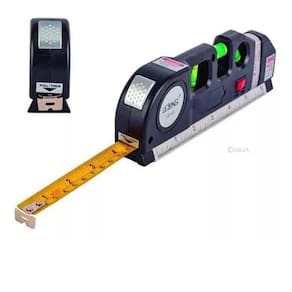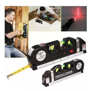 Laser com interruptor, base com régua em alumínio de 6 polegadas e trena de aço de 2,5 metros. Trena de 2.5m Laser 63-680nm Max output 5mW Class IIIa Laser atinge até 8m de distância Funciona com 3 baterias AG13 (inclusas)