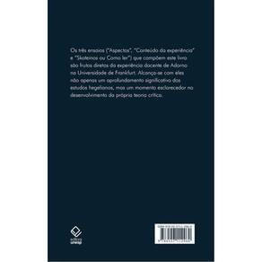 Os três ensaios (“Aspectos”, “Conteúdo da experiência” e “Skoteinos ou Como ler”) que compõem este livro são frutos diretos da experiência docente de Adorno na Universidade de Frankfurt. Alcança-se aí não apenas um aprofundamento significativo dos estudos hegelianos, mas um momento esclarecedor no desenvolvimento da própria teoria crítica.