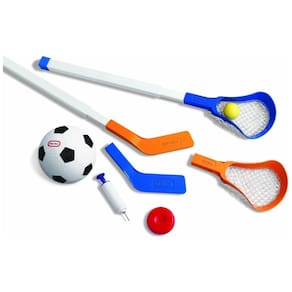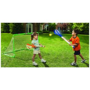 Três jogos em um Futebol, Hóquei, Lacrosse Rede de futebol ajustável A altura da rede se ajusta de 101 a e o comprimento se ajusta de 71 a Os acessórios incluem 1 bola de futebol, 1 bola de lacrosse, 1 disco de hóquei, 1 bomba de bola, 2 bastões ajustáveis com extremidades intercambiáveis para hóquei ou lacrosse Montagem necessária Idade 2 a 6 anos Marca: Não Informado