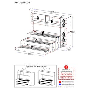 Dimensões do produto montado: Tricama - Altura: 68cm | Largura: 197cm | Profundidade: 95cm Guarda-Roupas - 183cm | Largura: 244,5cm | Profundidade: 46,5cm *Você pode consultar as medidas internas na imagem técnica do produto.